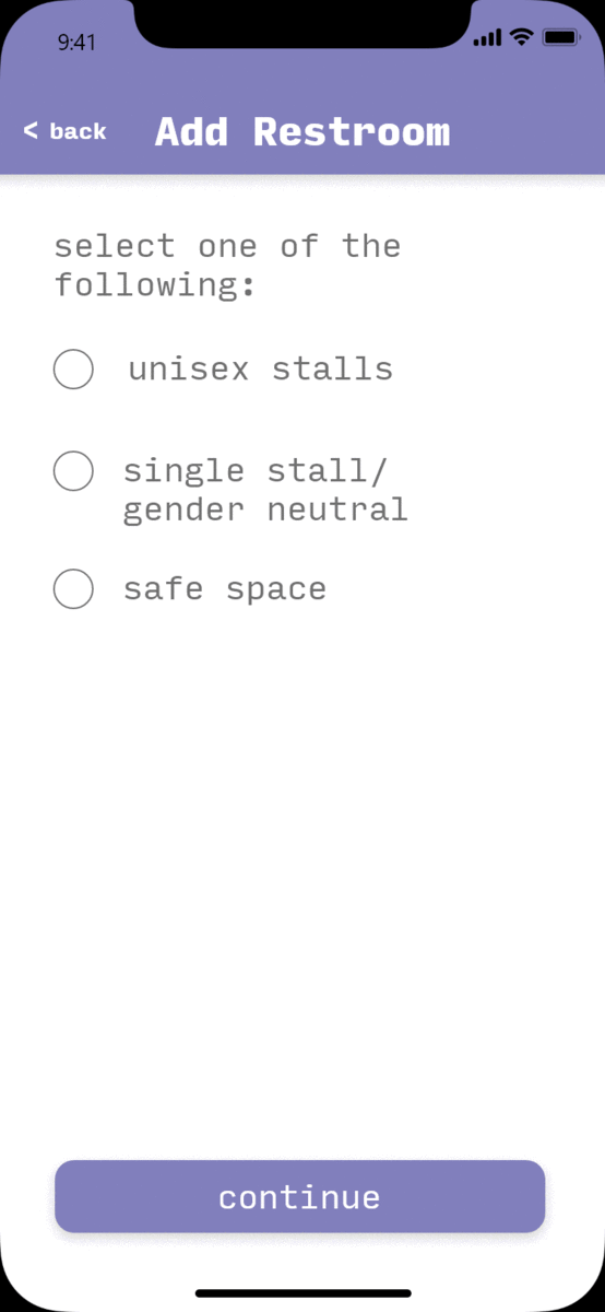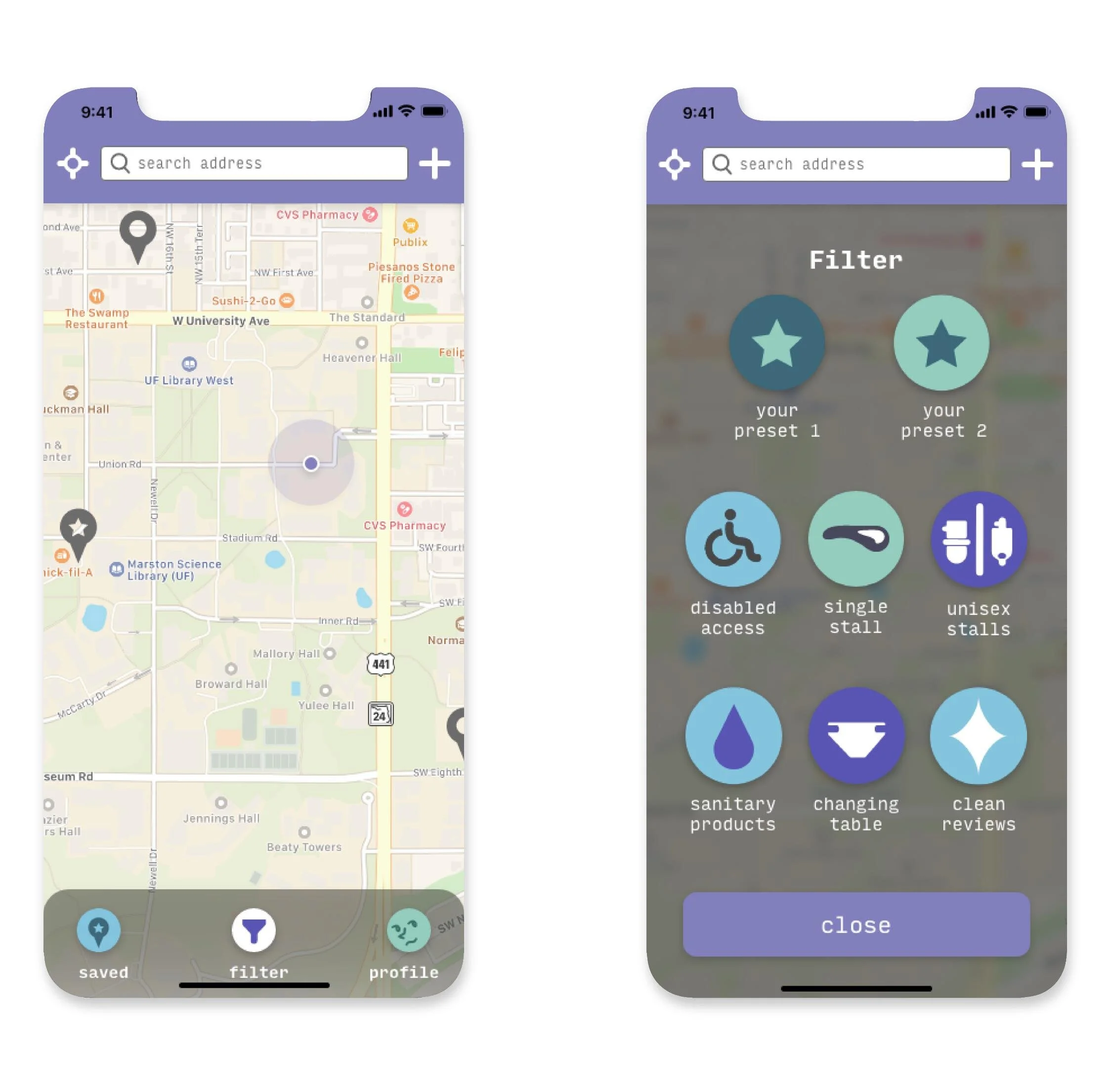 I designed a toilet-finding app that shows gender-neutral restroom locations for trans people, gender nonconforming people, and people who feel unsafe/uncomfortable using traditional male or female bathrooms. The app allows users to save unisex and/or accessible restroom locations, submit new locations, and read and write reviews.